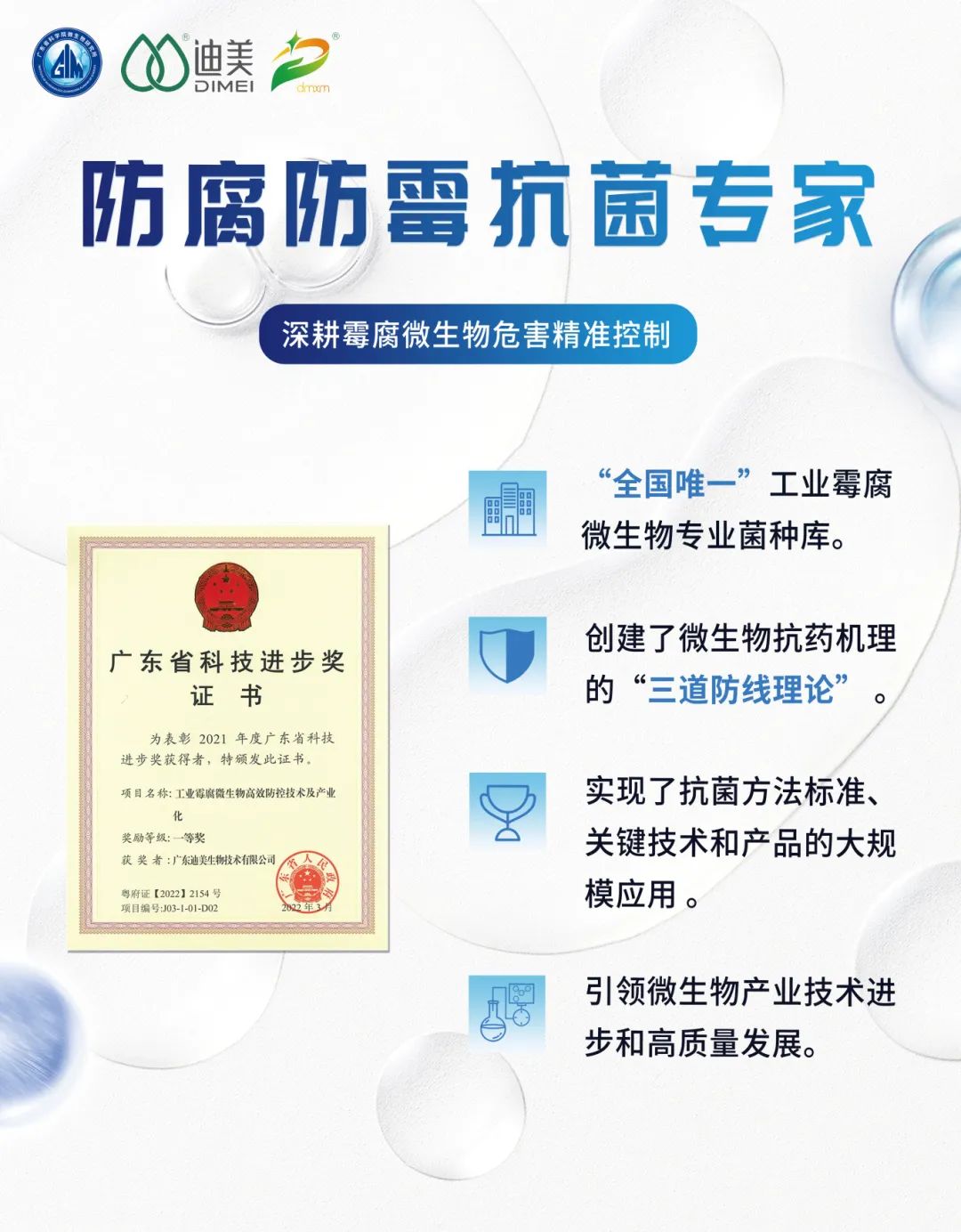 迪美秉承高效协同、共享共赢的价值观,实施“三位一体”战略,为客户提供坚实可靠的保障。作为广东省科学院微生物研究所科技成果的重要转化平台,我们汇聚资深专家团队,持续输出创新技术,为行业的持续发展贡献力量。作为防腐防霉抗菌领域的权威专家,迪美拥有“全国唯一”的工业霉腐微生物专业菌种库,并创建了具有开创性的微生物抗药机理“三道防线理论”。此外,我们与第三方专业微生物检测机构——广东省微生物分析检测中心紧密合作,共同为客户提供专业的检测服务,确保细菌无处遁形。